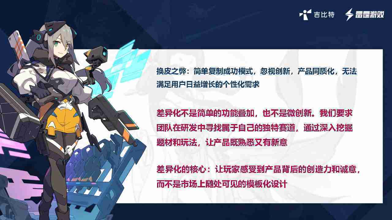 在我们内部是这么定义差异化的。。。。首先,,,,差异化不是简单的功能叠加,,,更不是换皮。。只是换皮,,产品无法提供有效的市场价值。。。。内部经常说差异化的产品不是为了迎合市场,,,而是找到一个自己独特的表达方式,,,在研发中找到属于自己的细分赛道和独特赛道,,,,前提是需要对这个题材有足够的深入、、、挖掘,,,,对玩法有足够深入的理解,,,让产品看起来既熟悉又有新意。。。