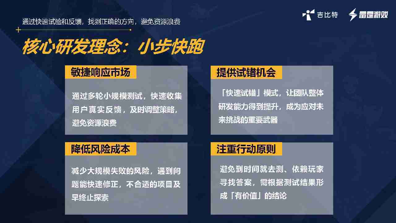 从目前的实践来看,,,内容向确实不合适,,因为小步快跑更适合做玩法的尝试,,但是如果是内容项,,,,玩法已经确定的,,这时候应该做切片,,,,而不是做小步快跑的方式,,因为做切片的成本是很高的。。我们有过两个项目,,要花很长时间做切片的内容,,,,而切片内容只占整个项目的1/10,,但要花的时间成本、、、、人力成本、、、经济成本可能会到1/3,,所以用很短的时间做游戏的原型,,验证其好不好玩,,,是想尝试在粗糙表达的情况下,,,,看看能否获得非常好的留存表现。。。如果留存表现非常好,,证明游戏内容体验是比较准确和非常好的内核,,我们会尝试加外围内容的拓展。。。