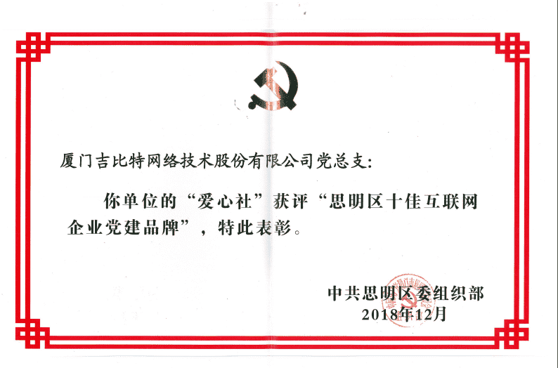 经初审评选、、、网络评选和专家评审等环节,,"厦门J9.COM网络技术股份有限公司党总支-爱心社" 从全区28个参评党建品牌中脱颖而出,,,,获评"思明区十佳互联网企业党建品牌"。。。