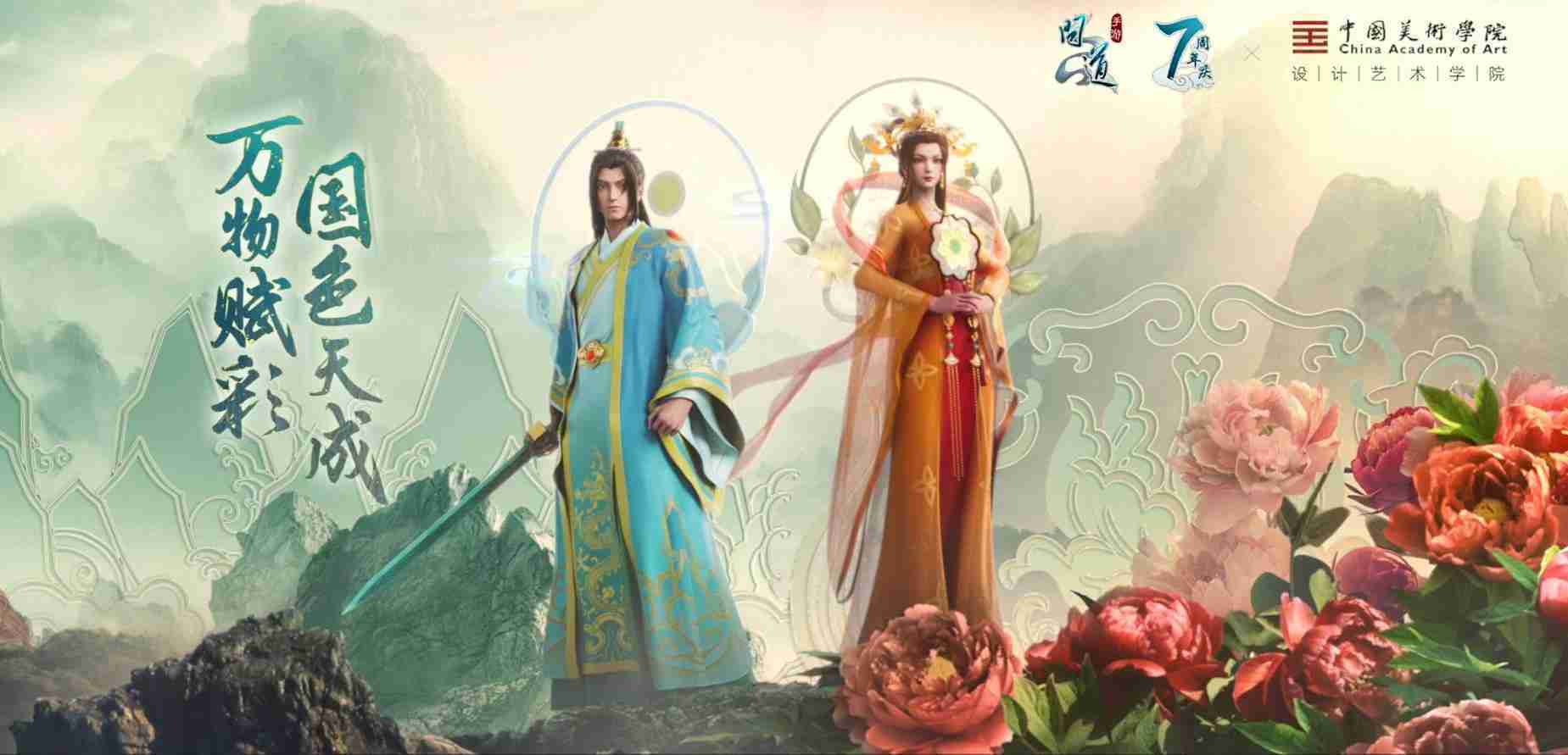 2023年4月,,《问道手游》联动中国美术学院,,,,在游戏中融合了中国历史上不同时期的文化元素,,,打造了“山河万象”与“凤鸣九霄”的国风时装。。。。在色彩配置方面,,创作团队基于对游戏角色特性的分析提取相应的文化内涵,,,从每一种色彩的色相、、、、指代事物和情感出发对应角色属性,,,,选定服装的色彩搭配。。。。在纹样设计方面,,创作团队结合游戏角色自身特殊的造型比例和形态,,,,在实际的纹样设计中进行了游戏语境下的活化演绎。。。。男性角色集中使用了如蟒纹、、海水江崖纹、、、、如意纹和云气纹等传统纹样元素,,,,女性角色则吸纳了凤凰纹、、牡丹纹、、卷草缠枝纹等元素,,,组成以“双凤牡丹纹样”“缠枝牡丹纹”“金玉凤冠头饰”为主要纹样的游戏角色装饰图案系统。。。。