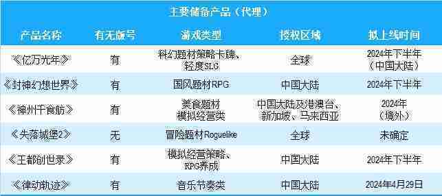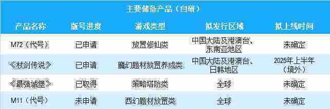 公司有多款储备产品,,涵盖放置类、、、、策略类、、RPG、、、Roguelike等多元化游戏品类,,,,储备的主要自研和代理产品如下:::